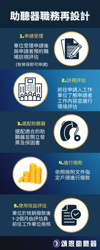 好消息是政府有提供「職務再設計」補助!透過職務再設計補助及專業諮詢輔導等措施,提供助聽輔具和助聽器補助,協助聽損者克服工作障礙、增進工作效能,並結合專業機構、團體及相關單位,促進身心障礙者、中高齡者順利就業。