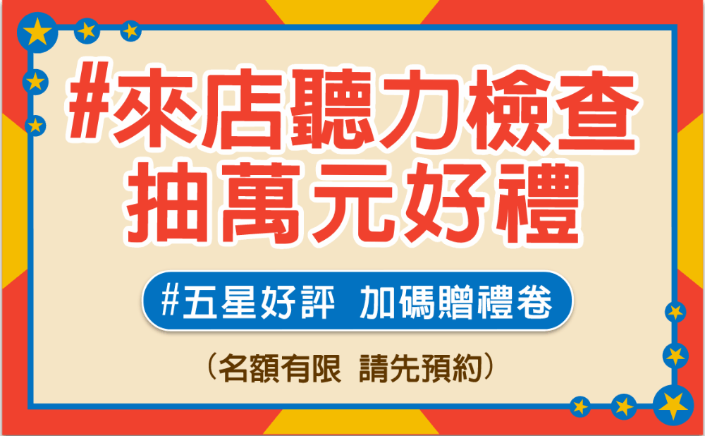 新客來店完成聽力檢查並留下20字以上Google五星好評,獲取限量全聯禮券乙張(100元)。