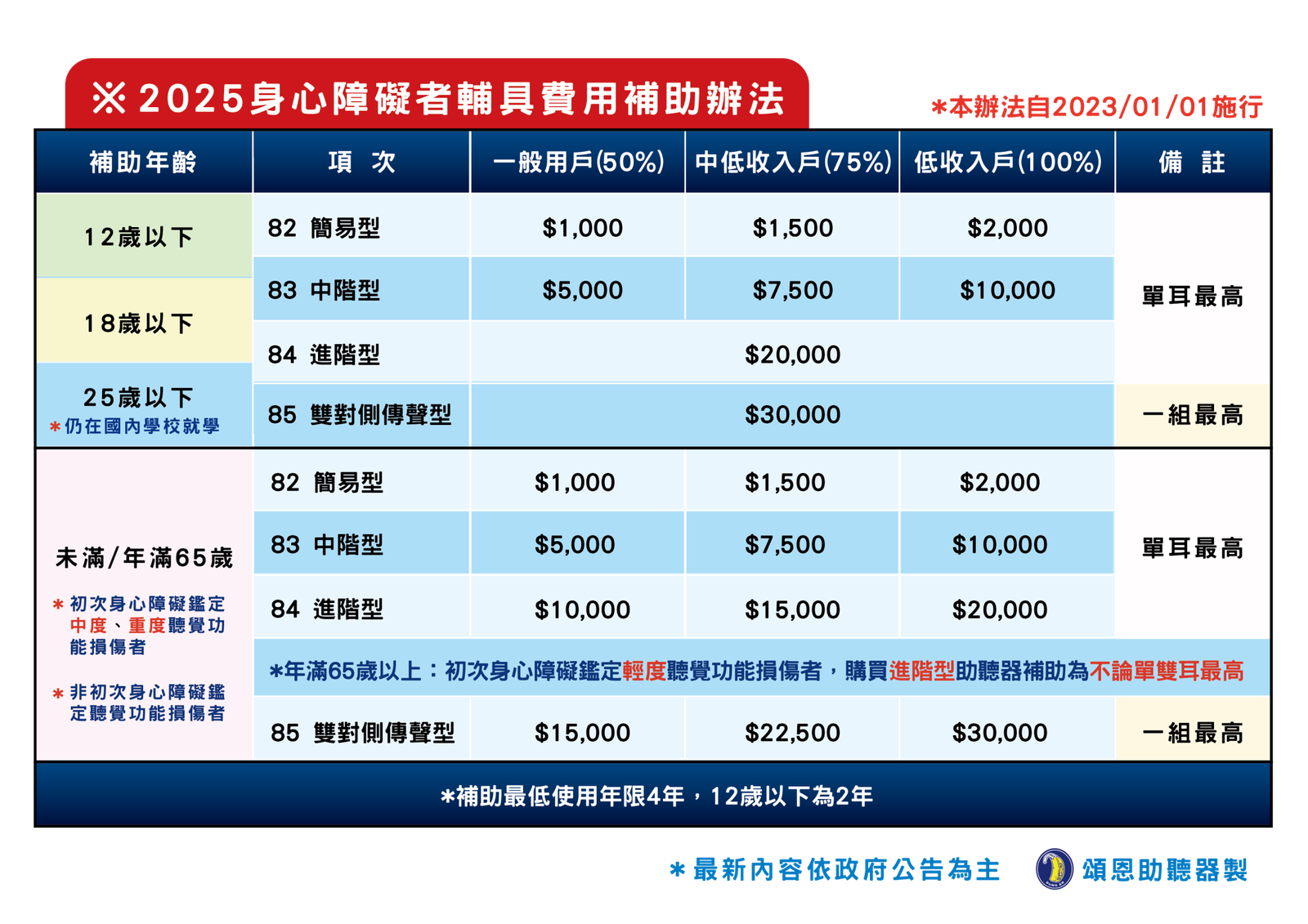 - 初次鑑定年齡超過65歲鑑定結果為「輕度聽力損失者」,申請進階型助聽器不分單雙耳,低收入戶最高總補助金額新臺幣20,000元、中低收入戶最高總補助金額新臺幣15,000元、一般戶最高總補助金額新臺幣10,000元。