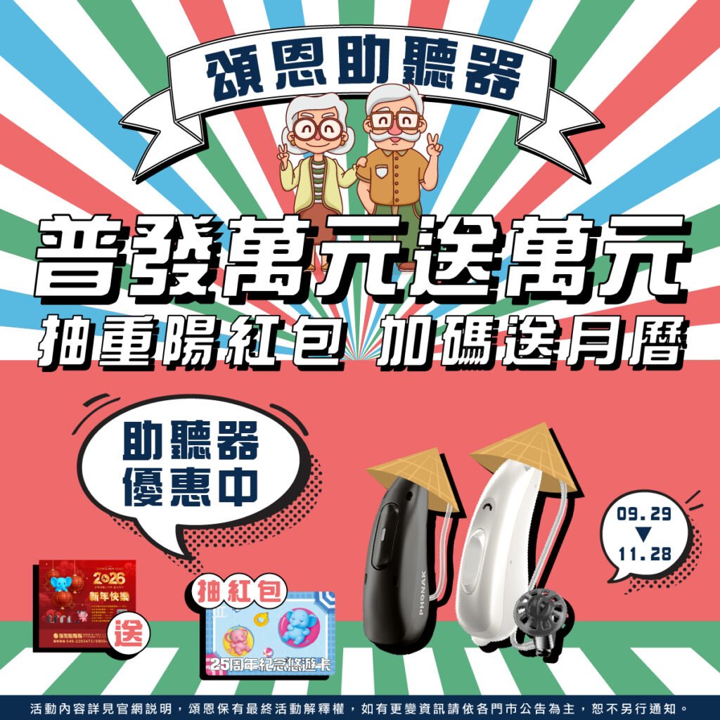 Phonak、Audio Service 等多品牌 AI 助聽器優惠一次到位,科技帶來智慧聆聽,活動則送上復古風滿滿的驚喜禮。凡購機就有機會參加萬元抽獎、帶回品牌月曆;即使只是到店體驗,也能獲得精美小禮。重陽佳節,一次把孝心、實惠與祝福全都送到長輩心裡。